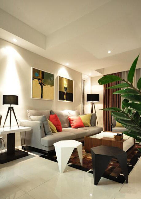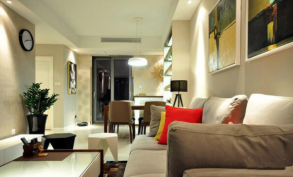 沙發(fā)墻上的兩幅現(xiàn)代畫,很巧妙的點綴了客廳的氣氛,也凸顯出主人不錯的品味。黑白兩個小凳子也獨具個性。