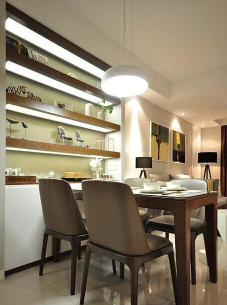 餐廳的一側,設計了置物架,不但可以放一些工藝品,也可以放些紅酒及茶具。
