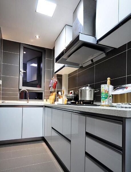 廚房以深色瓷磚為墻面,有耐臟的優(yōu)點。
