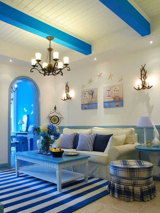 1.藍與白:這是比較典型的地中海顏色搭配。西班牙、摩洛哥海岸延伸到地中海的東岸希臘。希臘的白色村莊與沙灘和碧海、藍天連成一片,甚至門框、窗戶、椅面都是藍與白的配色,加上混著貝殼、細沙的墻面、小鵝卵石地、拼貼馬賽克、金銀鐵的金屬器皿,將藍與白不同程度的對比與組合發(fā)揮到極致