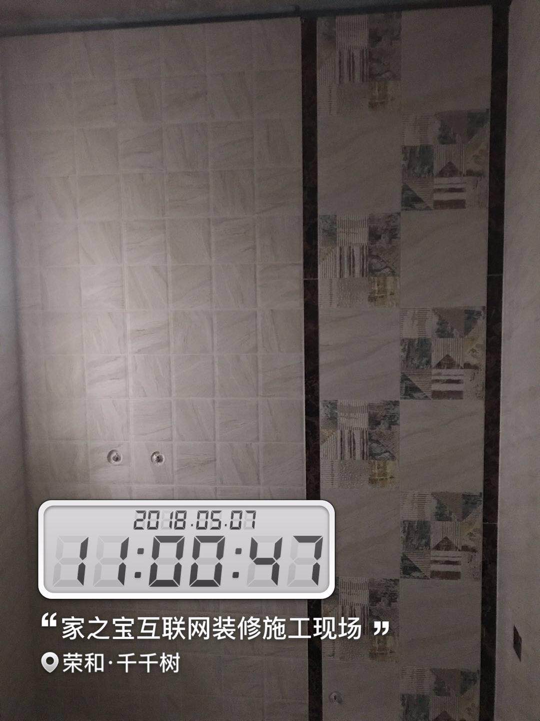 墻磚鋪貼,使用水平儀投射水平線,陽角處采用磨邊45°碰角工藝。