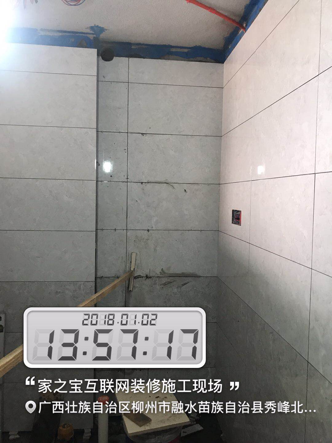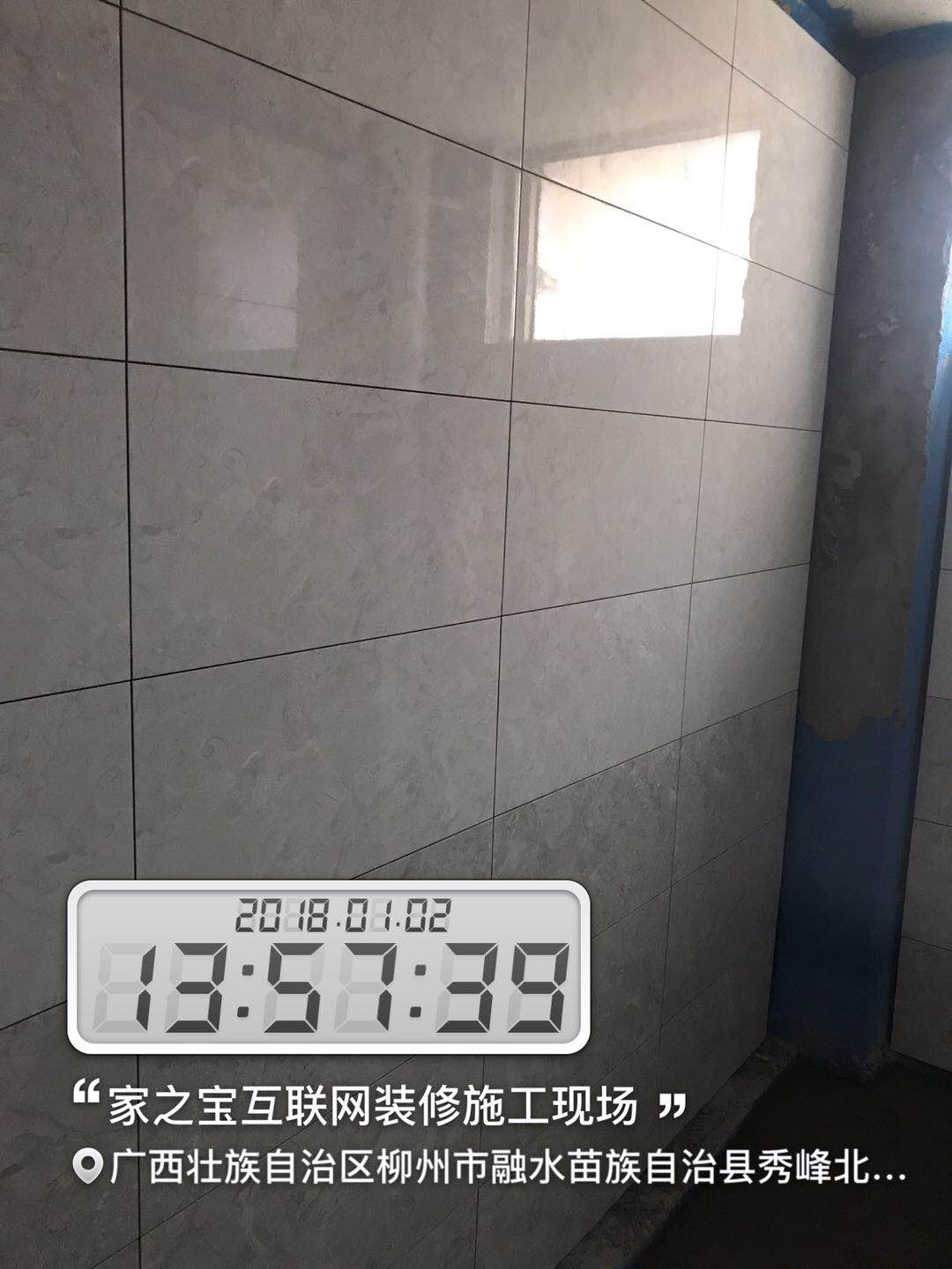 墻磚鋪貼,使用水平儀投射水平線,陽角處采用磨邊45°碰角工藝。