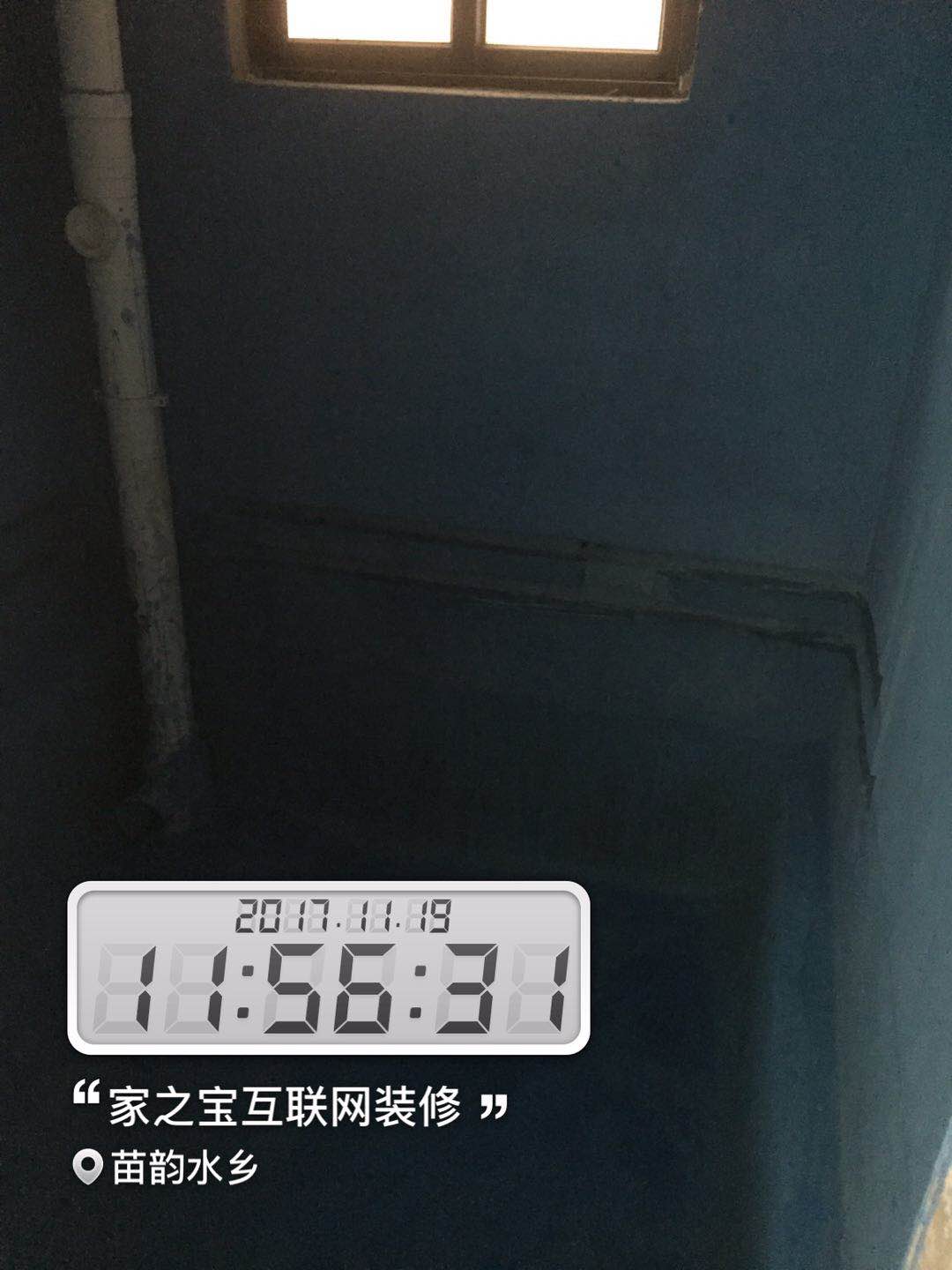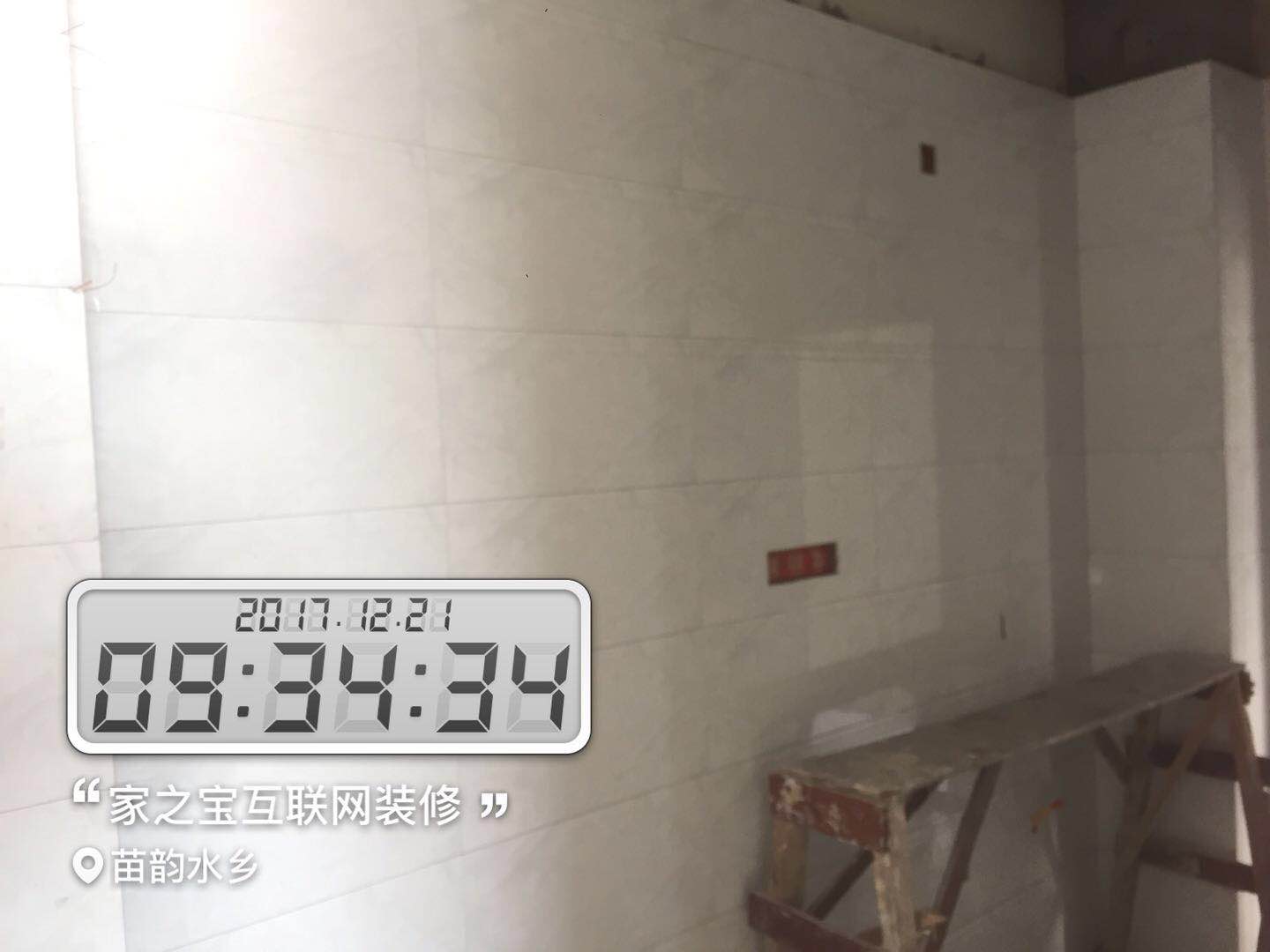 墻磚鋪貼,使用水平儀投射水平線,陽角處采用磨邊45°碰角工藝。