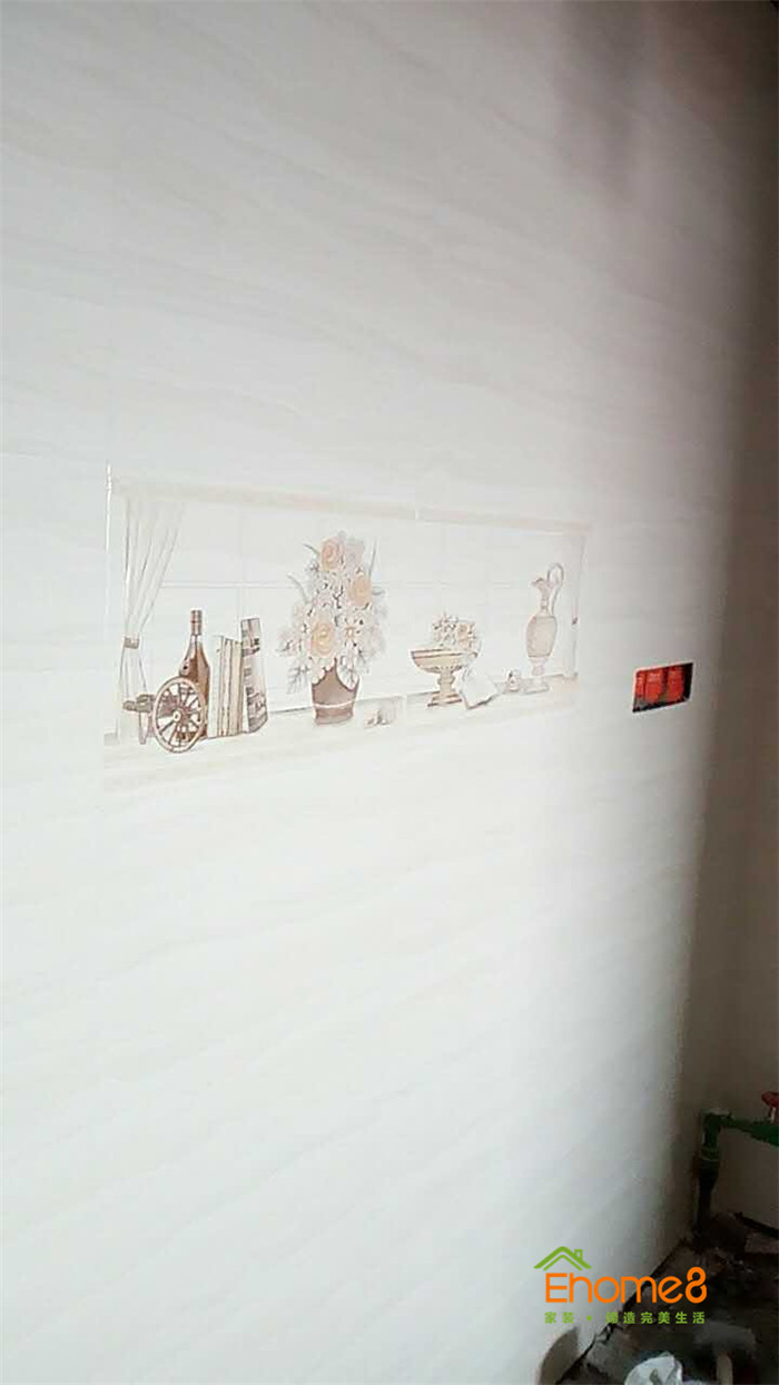 墻磚鋪貼,使用水平儀投射水平線,陽角處采用磨邊45°碰角工藝。