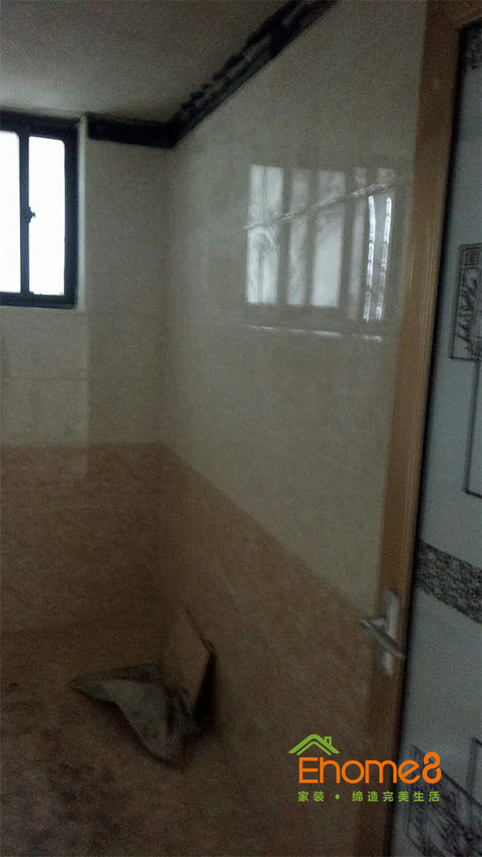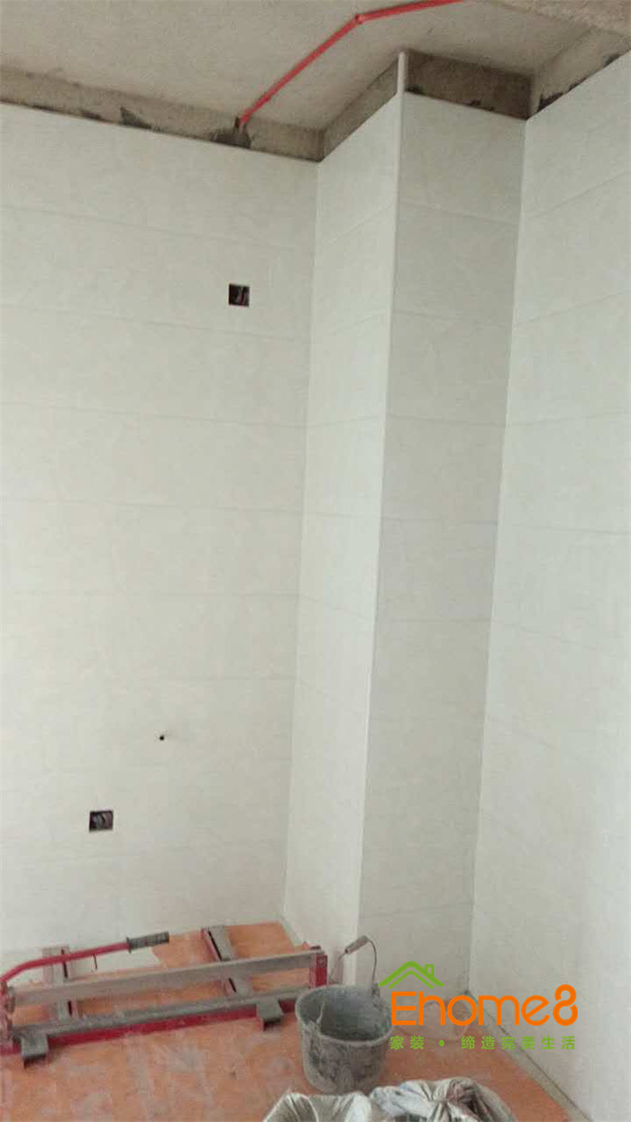 墻磚鋪貼,使用水平儀投射水平線,陽角處采用磨邊45°碰角工藝