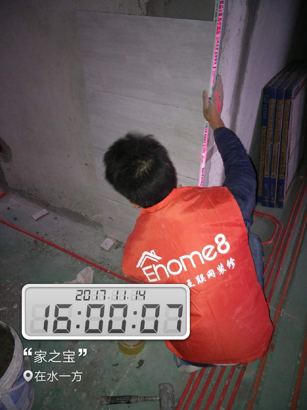 墻磚鋪貼,使用水平儀投射水平線,陽角處采用磨邊45°碰角工藝。