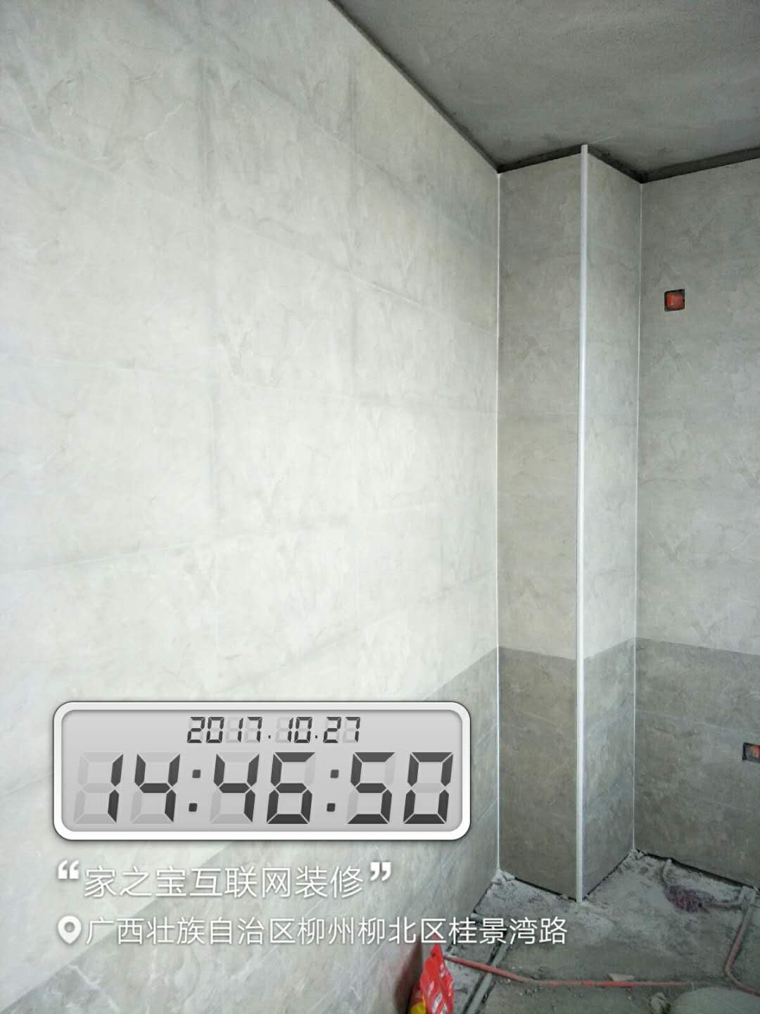 墻磚鋪貼,使用水平儀投射水平線,陽角處采用磨邊45°碰角工藝。