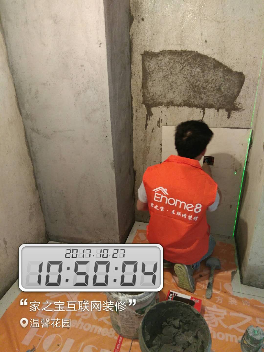 墻磚鋪貼,使用水平儀投射水平線,陽角處采用磨邊45°碰角工藝。